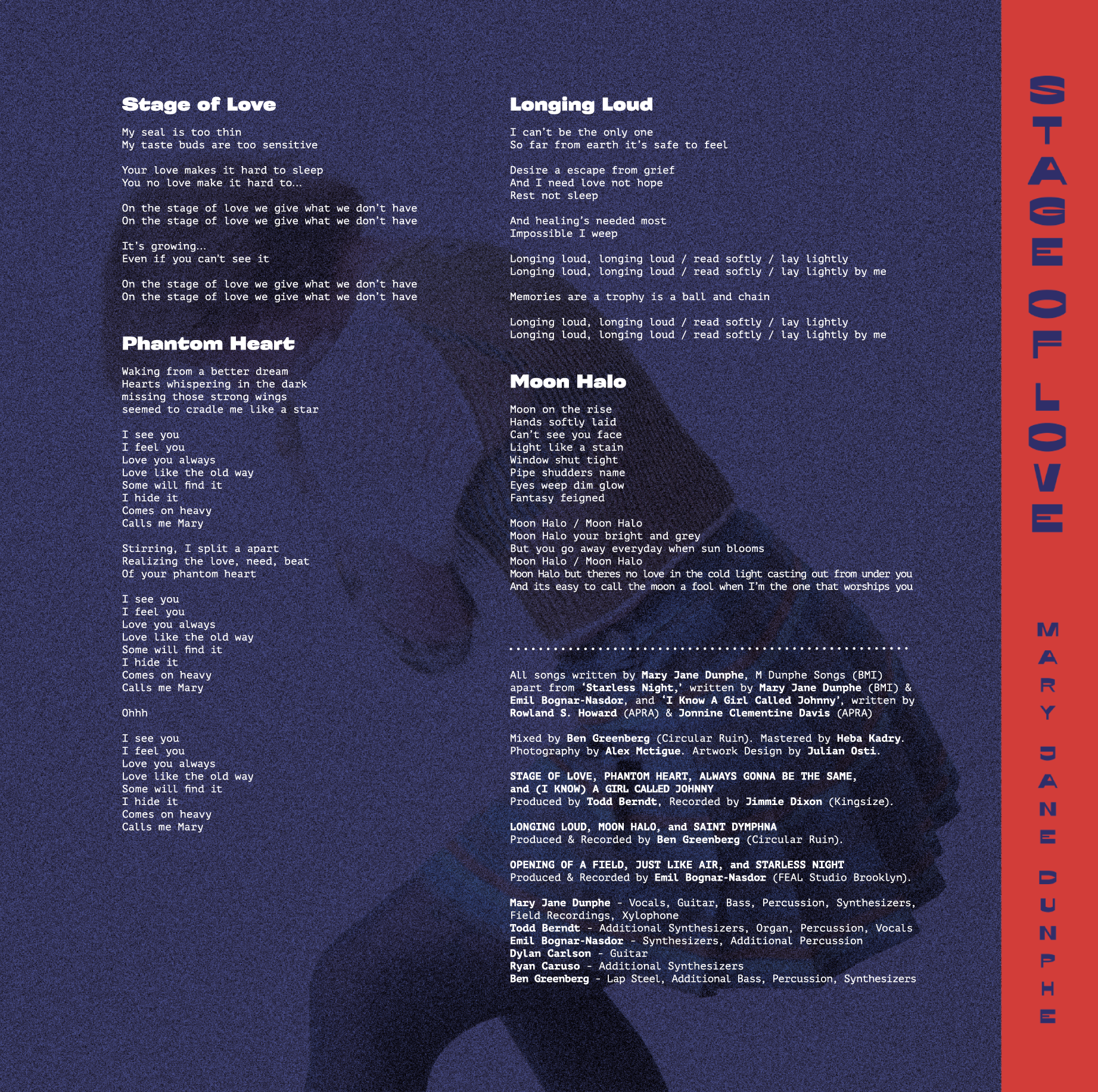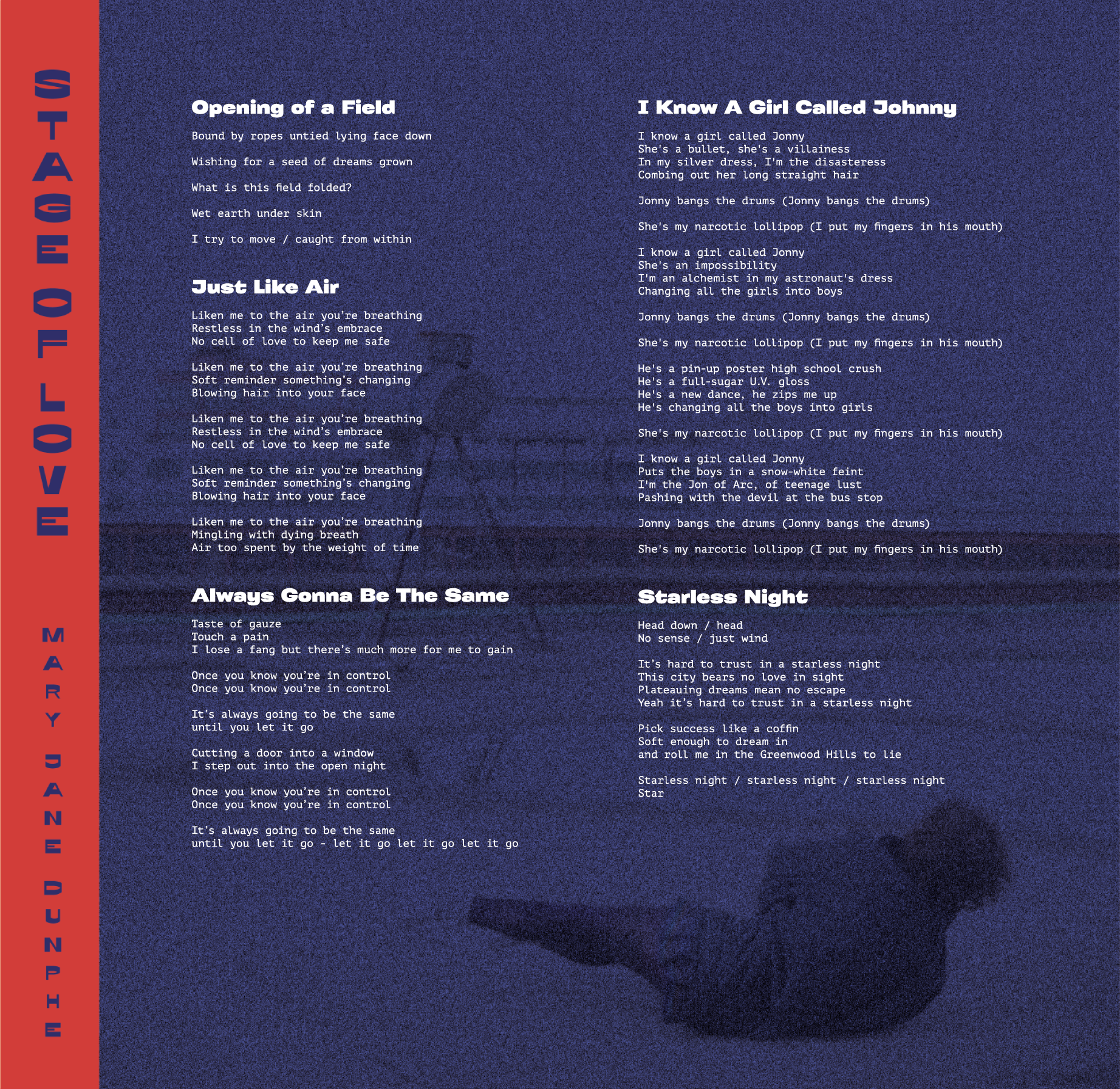 LP Design for pop artist Mary Jane Dunphe. The packaging includes a printed inner sleeve with lyrics and a hype sticker for the front cover.